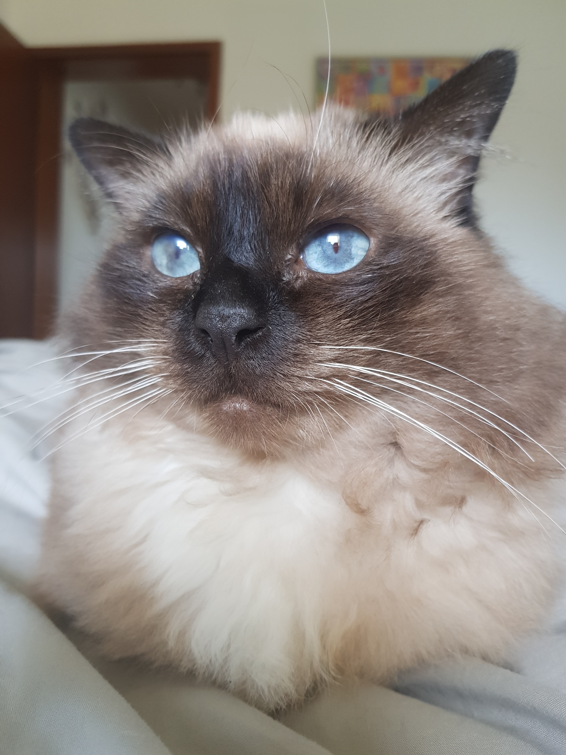Meine Fellfarbe ist blue-point (graublau an den Points) und meine Augen strahlen in leuchtendem Blau. Fellpflege betreibe ich am liebsten alleine – nur selten lasse ich die Menschen mit einer Bürste an mich heran. Nach 900 Tagen war ich dann schließlich so weit und ließ mich sogar länger als nur ein paar Sekunden bürsten. Wenn ich Kuscheleinheiten möchte, trotte ich zu den beiden und hole sie mir ab. Will ich meine Ruhe, lege ich mich in eines der Kissen oder Boxen auf der Fensterbank.
